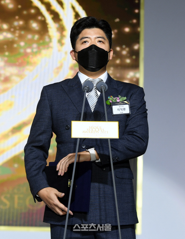 이덕환 유스나우 대표가 29일 그랜드하얏트서울 호텔 그랜드볼룸에서 진행된 제13회 2021 서울석세스대상 시상식에서 사회부문 글로벌청년단체대상을 수상한 뒤 소감을 밝히고 있다.